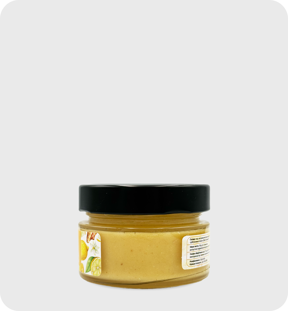 Тандем лимону з імбиром створений для підтримки імунітету, адже лимон є природним джерелом вітаміну С, а імбир цінують за антиоксидантні, протизапальні та антивірусні властивості. Крем-мед має яскравий цитрусово-пряний смак із легкою гостринкою. Чудовий додаток до теплого чаю.