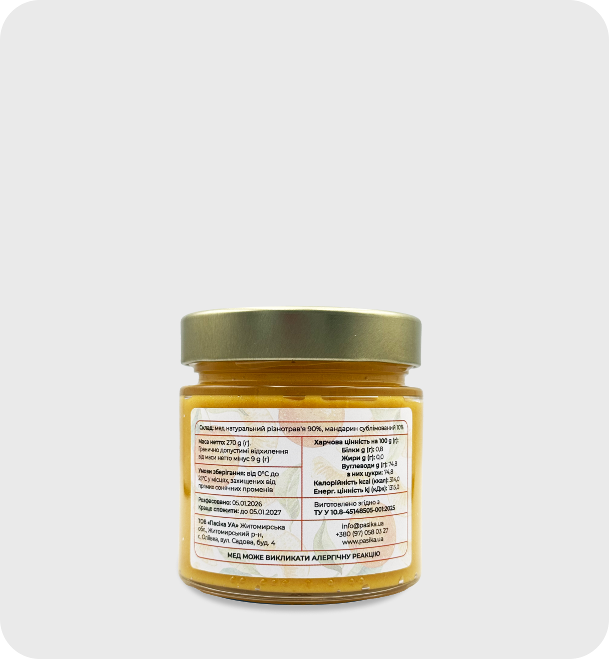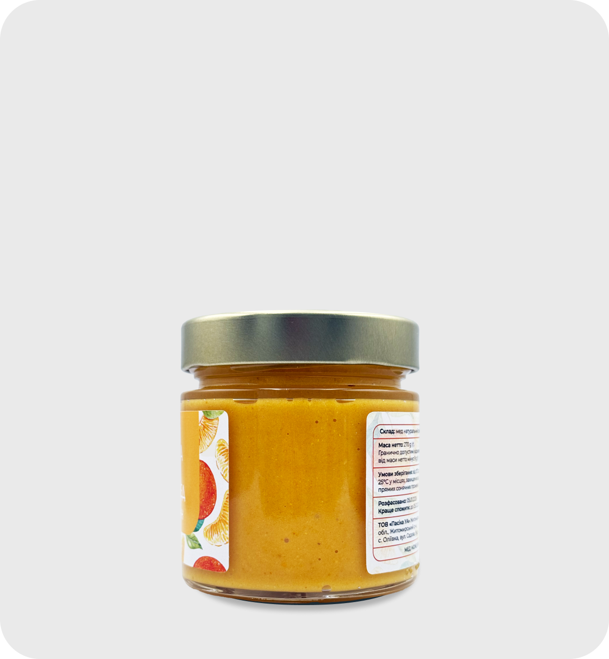 Мандарин — цитрус, який створює настрій. Він містить вітамін С, вітаміни групи В й антиоксиданти, які допомагають підтримувати імунітет у холодну пору та заряджають енергією. Крем мед із мандарином має м’який цитрусовий смак. Ідеальний до чаю, тостів, булочок і млинчиків