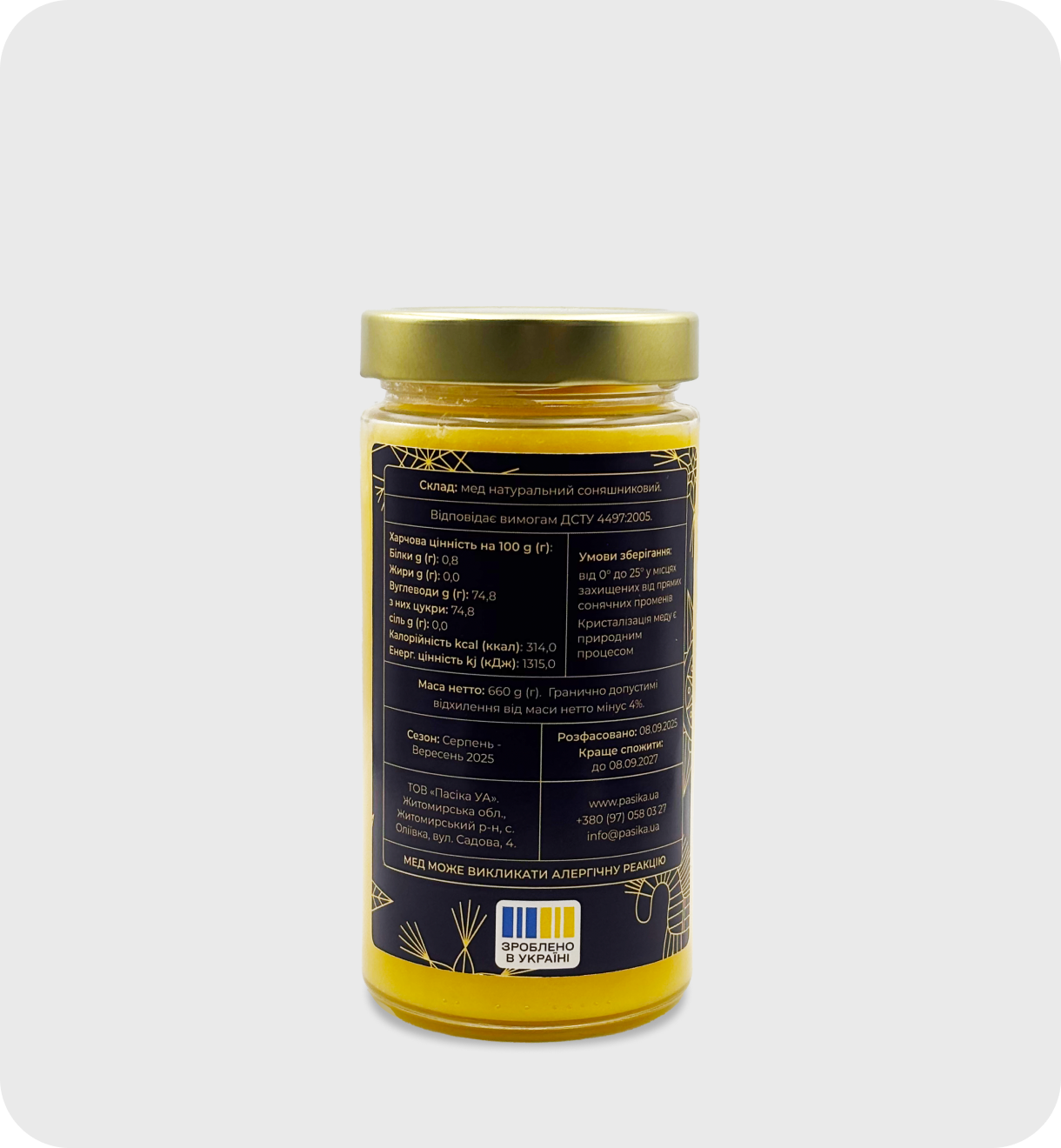 Мед натуральний, монофлорний, зібраний з квітів соняшнику. Ґатунок вищий.