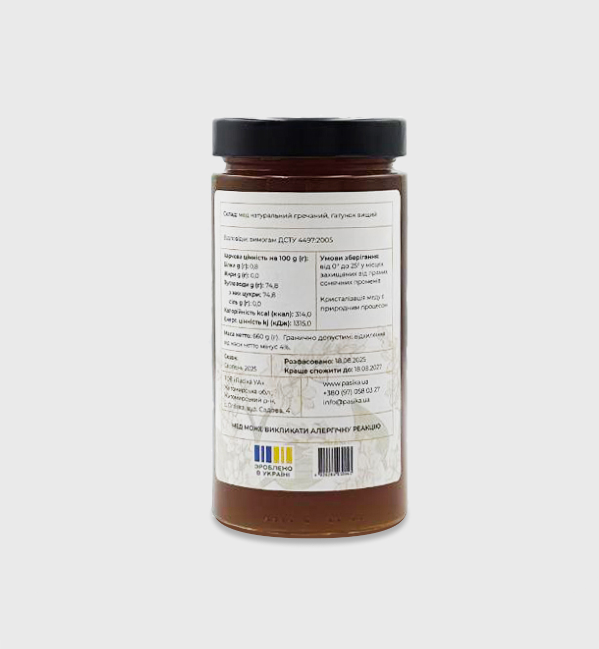 Мед натуральний, монофлорний, зібраний з квітів гречки. Ґатунок вищий.