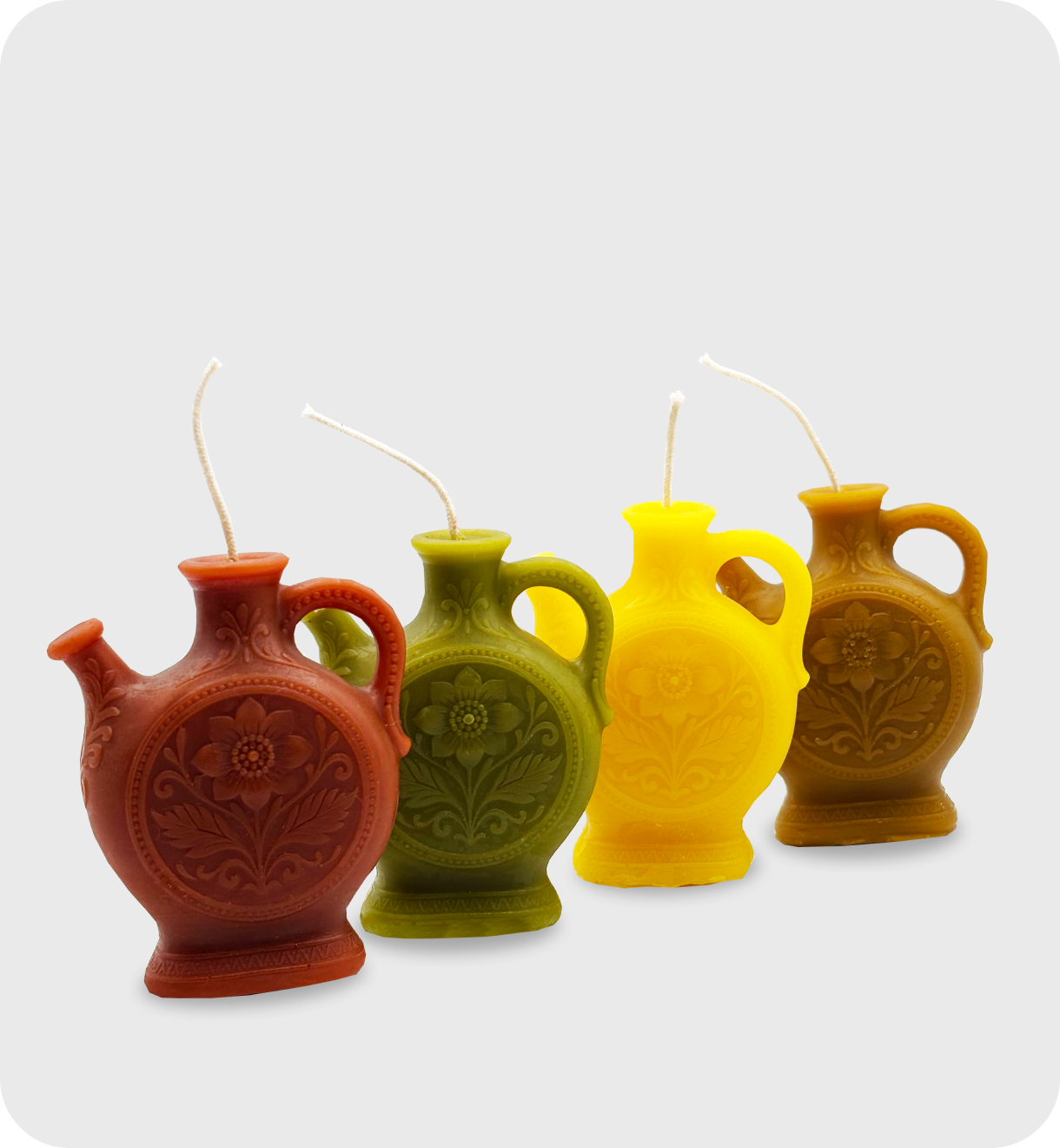 У наборі — чотири свічки у формі традиційного глиняного глека, кожна з яких виготовлена вручну зі 100% натурального бджолиного воску.